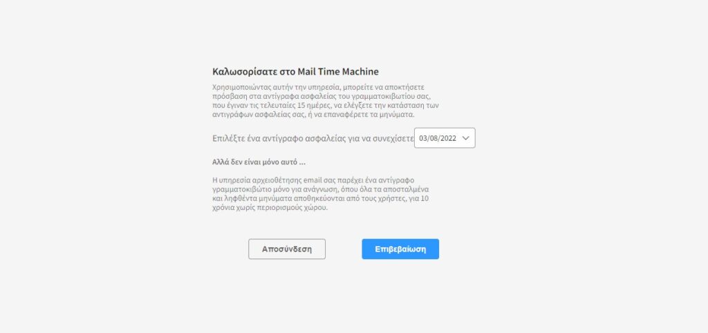 Τα backups προσφέρονται ως “read only” και δεν μπορούν να διαγραφούν ή επεξεργαστούν στην Mail Time υπηρεσία.
