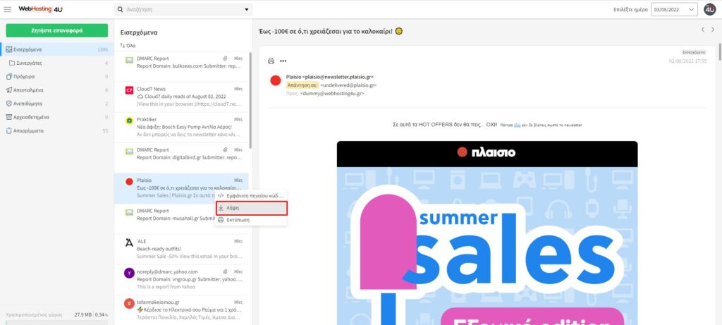 Να κατεβάσετε μεμονωμένα μυνήματα σε .eml format γιa MS-Outlook ή Mozilla Thunderbird.